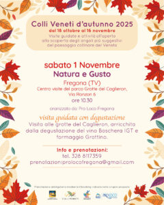 Sabato 1 e Domenica 2 Novembre la Pro Loco di Fregona organizza visite guidate delle Grotte del Caglieron arricchite da degustazioni del nostro Boschera IGT Colli Trevigiani e formaggio Grottino.